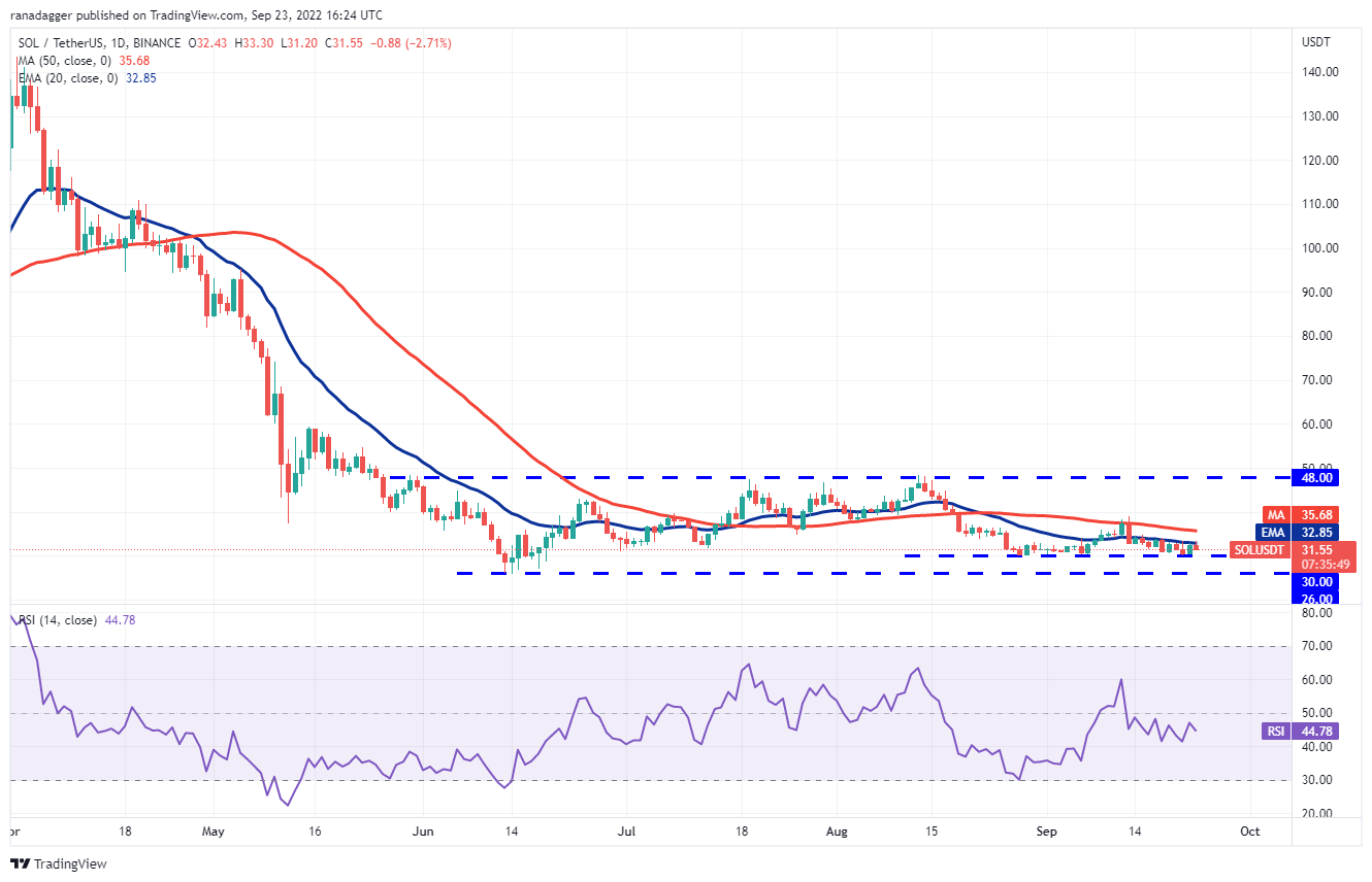 This uncertainty is unlikely to continue for long. The bears will try to seize control by pulling the price below $30. If that happens, the SOL/USDT pair could drop to the strong support at $26. The bulls are expected to defend this level aggressively because if this support cracks, the SOL/USDT pair could witness panic selling and drop toward $20.