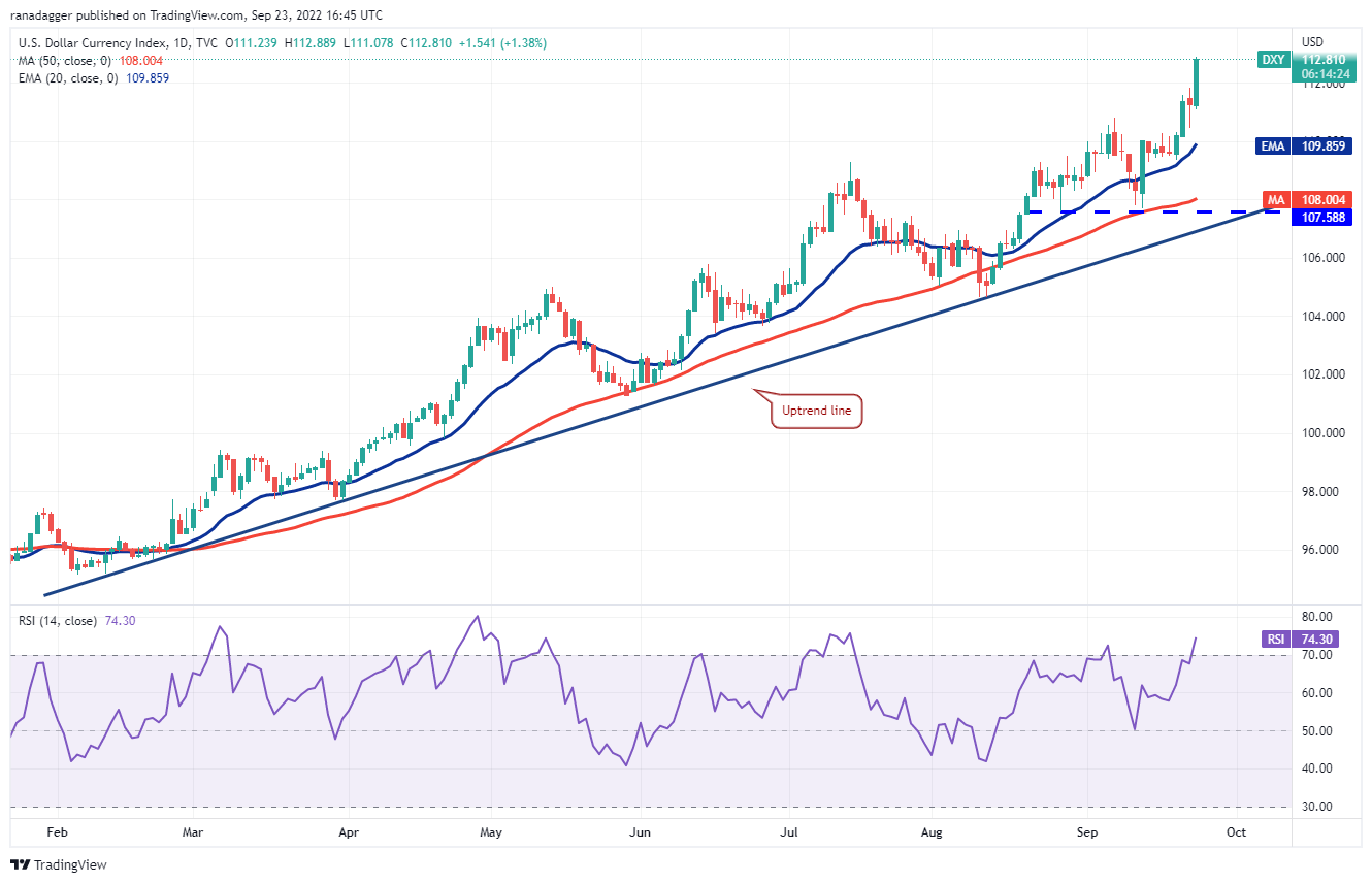 The U.S. dollar index (DXY) has been in a strong uptrend for the past few months. Every dip is being purchased aggressively and the index continues to scale new heights. Attempts by the bears to force a trend change failed when the price rebounded off the 50-day simple moving average (SMA) ($108) on Sept. 13.