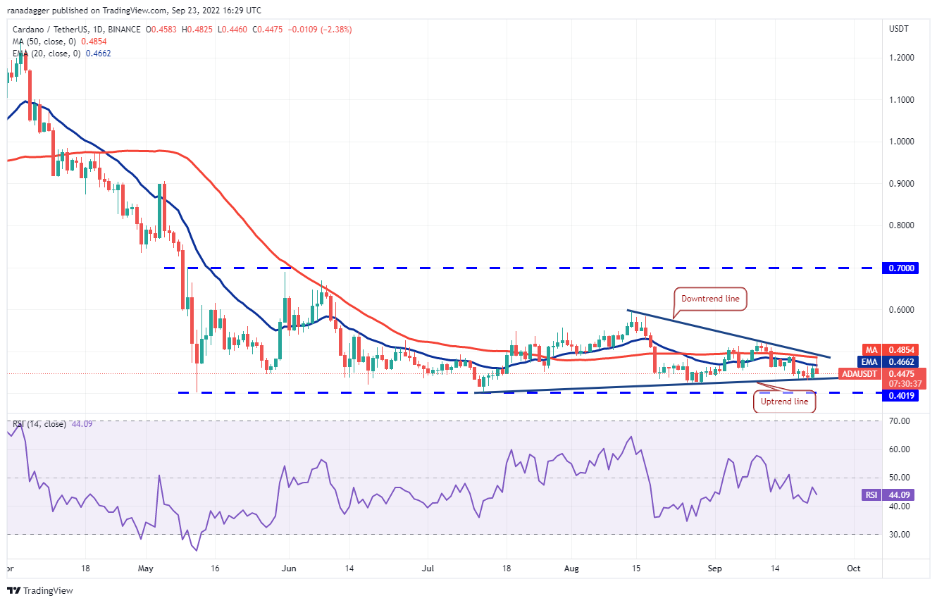 Cardano (ADA) bounced off the uptrend line on Sept. 22, indicating that bulls are defending this level with vigor. The price reached near the downtrend line on Sept. 23 but the long wick on the candlestick shows that bears are active at higher levels.