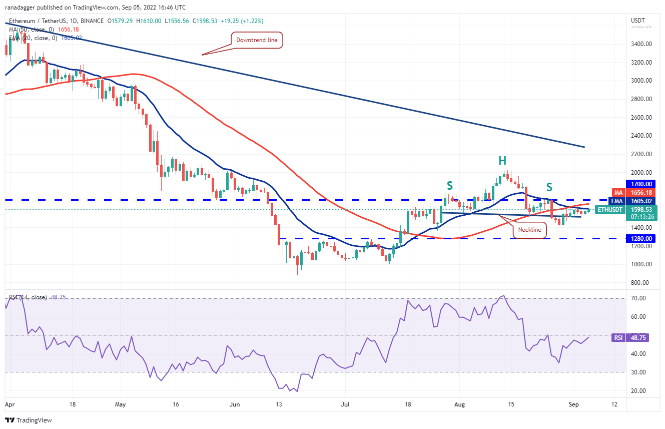 Ether (ETH) has been stuck between the 20-day EMA ($1,605) and the neckline of the head and shoulders (H&S) pattern since Aug. 31 but this tight-range trading is unlikely to continue for long.