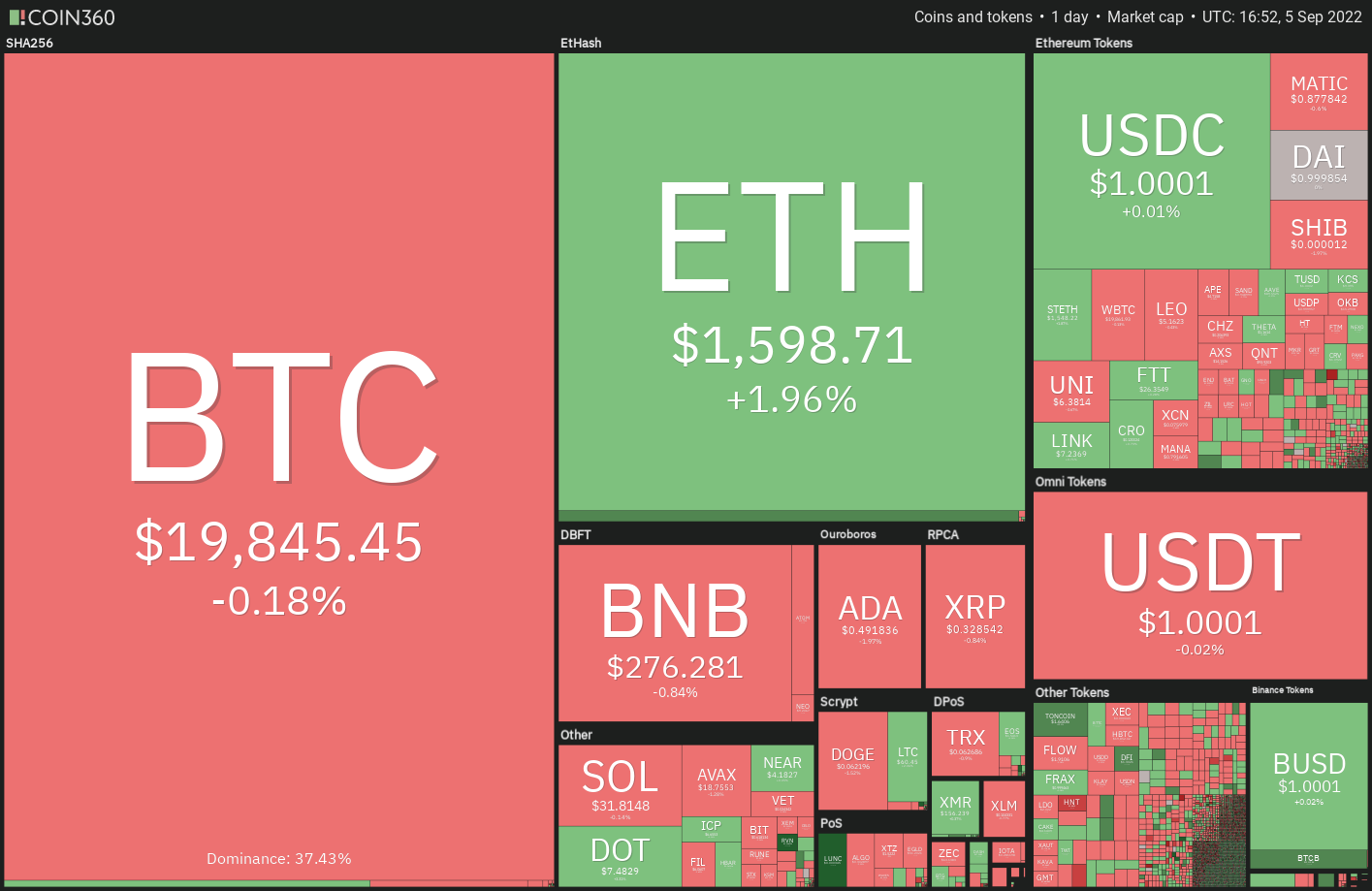 https://images.cointelegraph.com/images/840_aHR0cHM6Ly9zMy5jb2ludGVsZWdyYXBoLmNvbS91cGxvYWRzLzIwMjItMDkvNzZjMDI5M2YtMzQ2My00ZTAyLWI5ZGYtM2UzY2JmMWE3MzdhLmpwZw==.jpgThe cryptocurrency markets have been quiet over the weekend. The sideways price action continues on Sept. 5 and there are unlikely to be any fresh triggers from the United States equities markets, which are closed for Labor Day.
