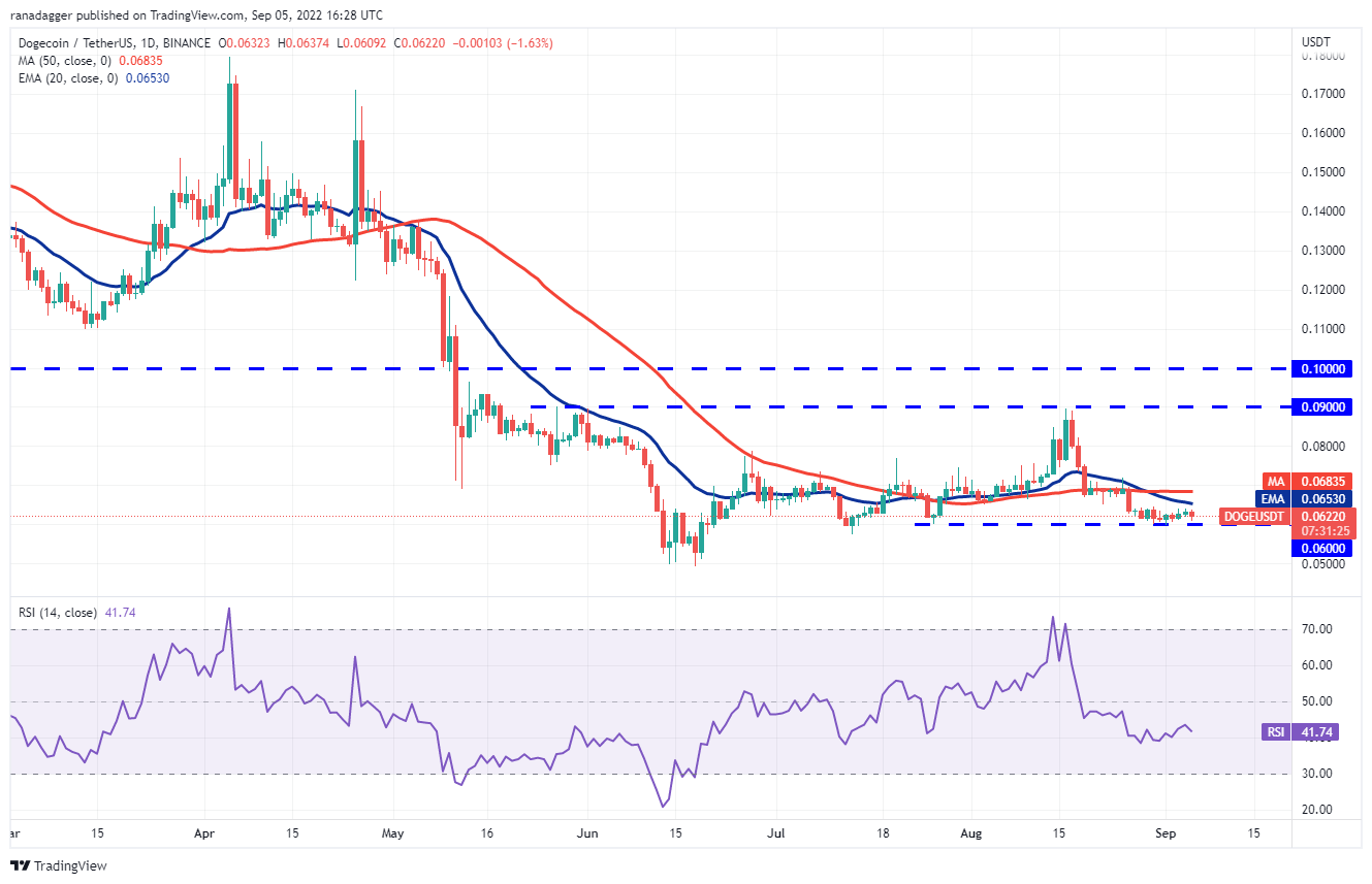A tight consolidation near a support usually results in a breakdown. The downsloping 20-day EMA ($0.06) and the RSI in the negative zone indicate the path of least resistance is to the downside. If bears sink and sustain the price below $0.06, the DOGE/USDT pair could drop to the crucial support at $0.05.