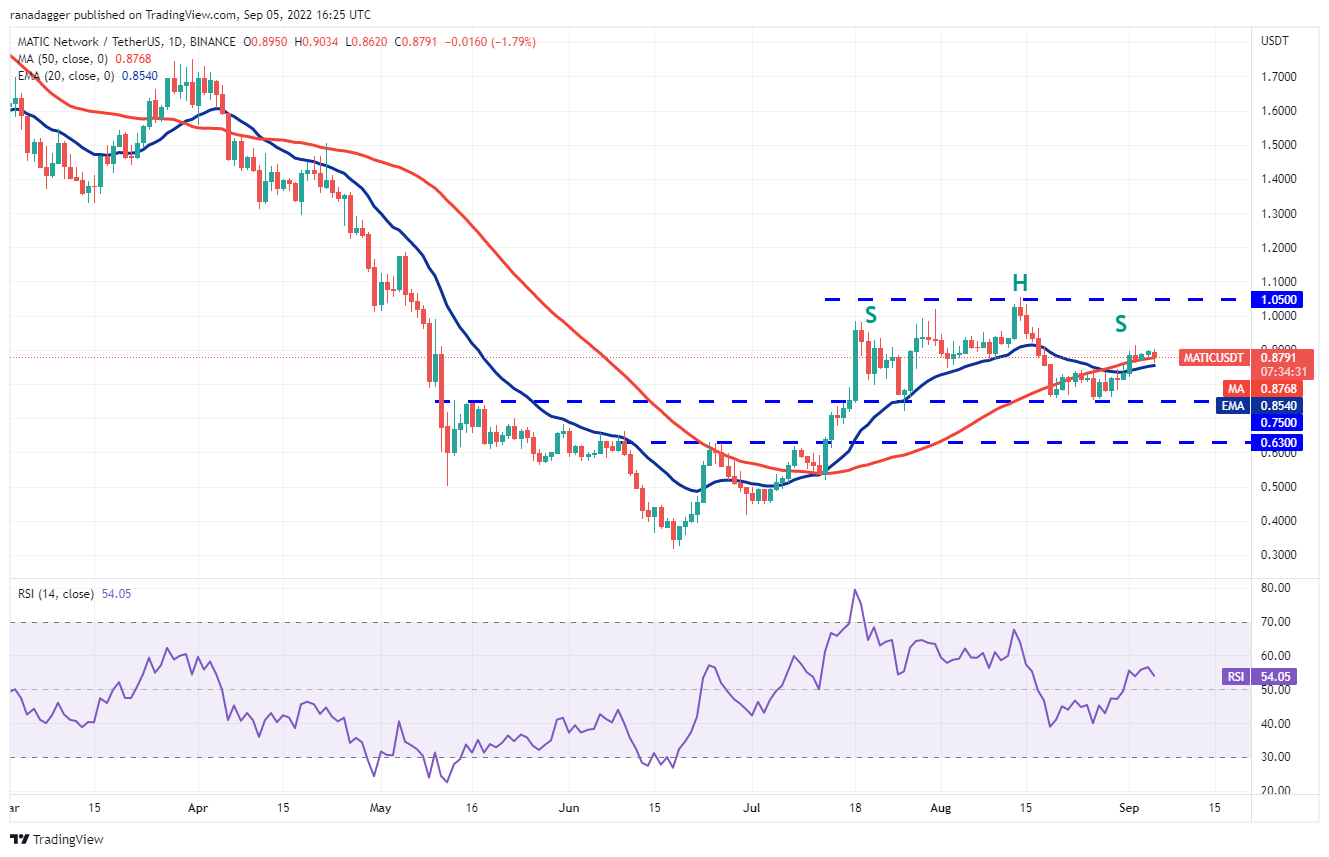 Polygon (MATIC) has been range-bound between $1.05 and $0.75 for the past several days. Although bulls pushed the price above the 50-day SMA ($0.88) on Sept. 1, they have not been able to build upon this strength. This indicates that demand dries up at higher levels.