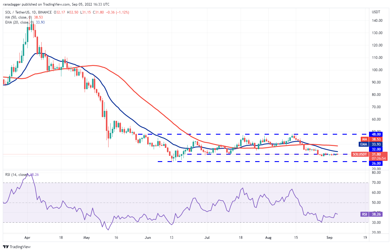 If the price turns down and slips below $30, the SOL/USDT pair could decline to the vital support at $26. This is an important level for the bulls to defend because if this support gives way, the pair could start the next leg of the downtrend.