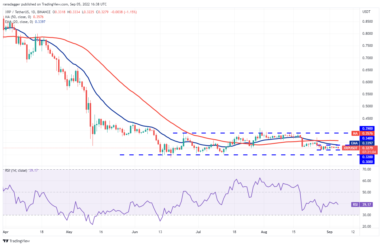 The bears will attempt to sink the price below $0.32. If they succeed, the XRP/USDT pair could extend its decline to the crucial support at $0.30. Buyers are likely to defend this level aggressively as they had done on three previous occasions.