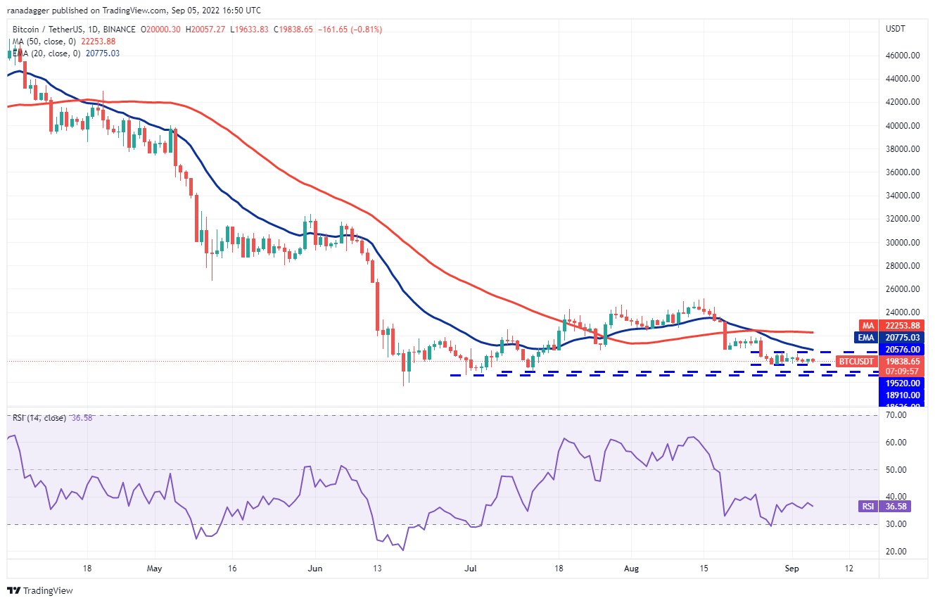 Bitcoin has been stuck inside a tight range between $19,520 and $20,576 for the past few days. This indicates indecision among the bulls and the bears. Although bulls are buying the dips, they have failed to clear the overhead resistance.