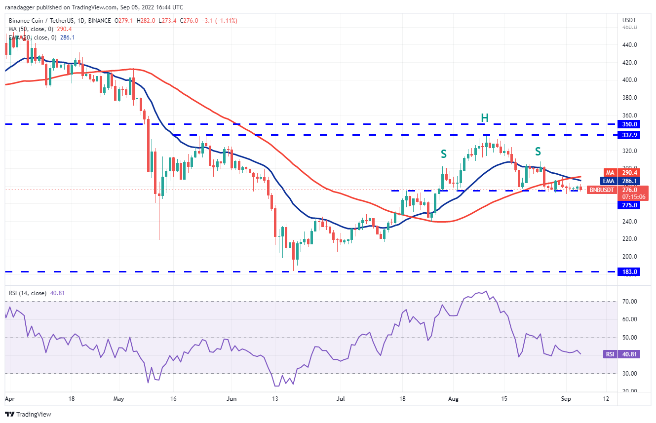 The 20-day EMA ($286) has been sloping down and the RSI is below 41, indicating that bears have the upper hand. If the price breaks and closes below $275, the BNB/USDT pair will complete a bearish head and shoulders pattern. The pair could then start its decline to $240 and later to the pattern target of $212.