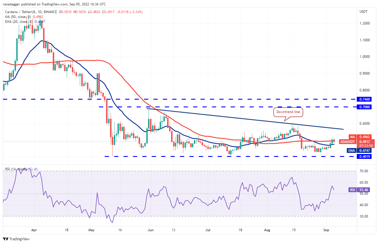 Cardano (ADA) broke and closed above the 50-day SMA ($0.49) on Sept. 4 but the bulls could not sustain the breakout. This suggests that bears continue to sell on rallies.
