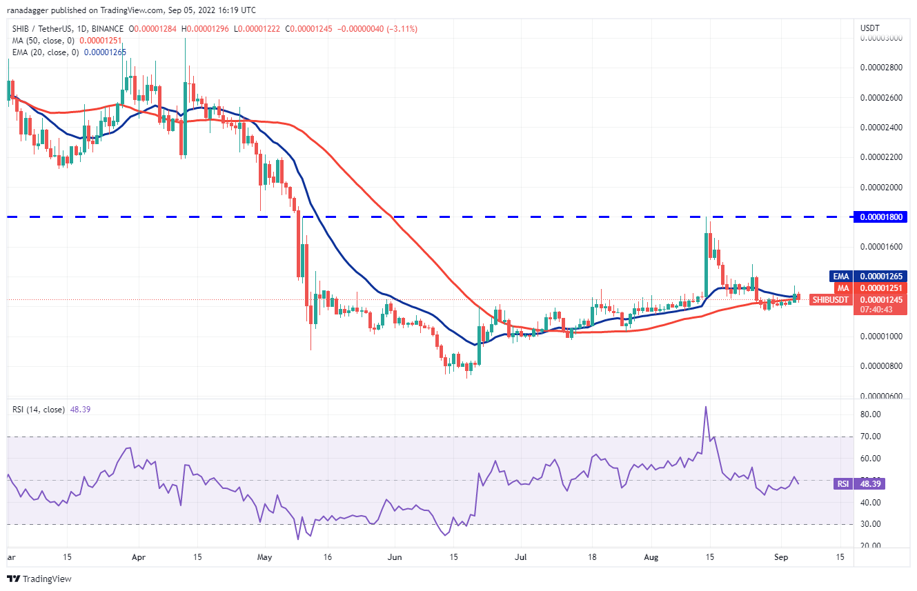 Buyers pushed Shiba Inu (SHIB) above the 20-day EMA ($0.000013) on Sept. 4 but the long wick on the day’s candlestick shows that bears are selling at higher levels.