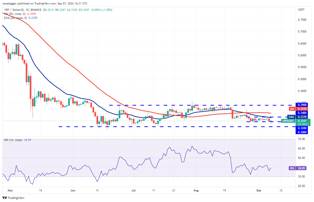 A minor positive is that the bulls have not allowed the price to sustain below $0.32. The long tail on the Sept. 7 candlestick shows buying at lower levels. If the price sustains above $0.32, the XRP/USDT pair could extend its range-bound action for some more time.
