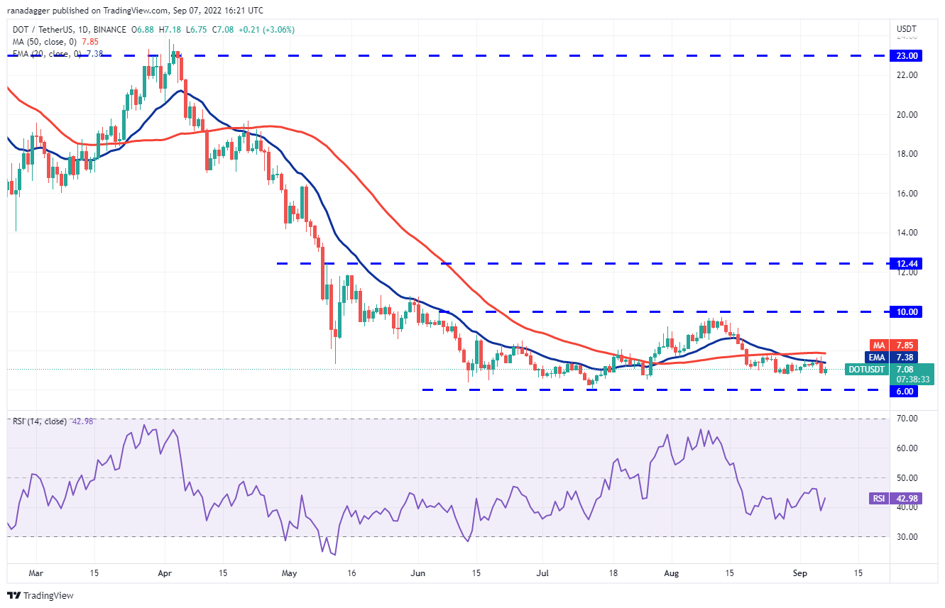 Buyers attempted to push Polkadot (DOT) above the moving averages on Sept. 5 and 6 but the bears defended the level aggressively as seen from the long wick on the candlesticks.