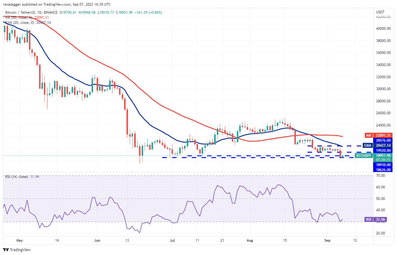 That could sink the pair to the vital support at $17,622. A break and close below this level could signal the resumption of the downtrend. The downsloping 20-day exponential moving average (EMA)($20,427) and the relative strength index (RSI) near the oversold territory indicate that bears are in control.