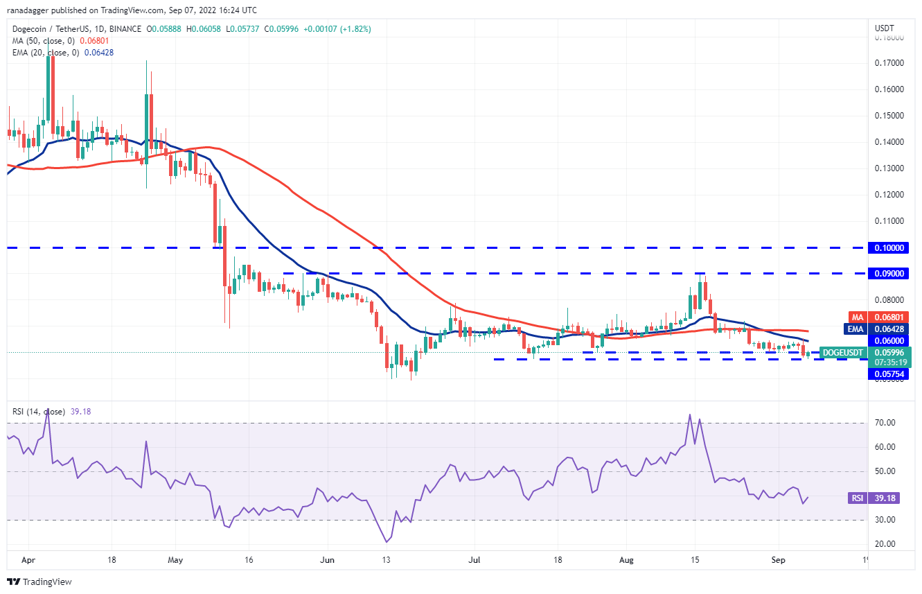 The bulls attempted to push Dogecoin (DOGE) above the 20-day EMA ($0.06) on Sept. 6 but the bears sold the rally aggressively and pulled the price below the immediate support at $0.06.