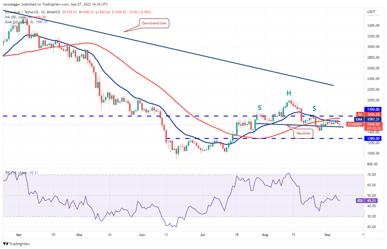The bears will try to build upon the advantage and sink the price below the neckline of the head and shoulders (H&S) pattern. If they succeed, the ETH/USDT pair could drop to $1,422 and then to the important support at $1,280. The pattern target of this bearish setup is $1,050.