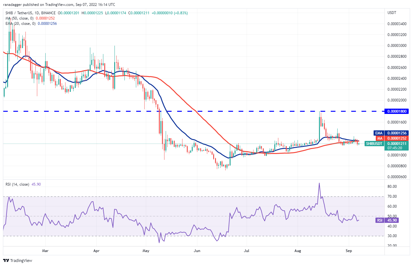 The bulls purchased the dip in Shiba Inu (SHIB) on Sept. 5 but they could not sustain the price above the 20-day EMA ($0.000013). This indicates that bears are selling on every minor rally.