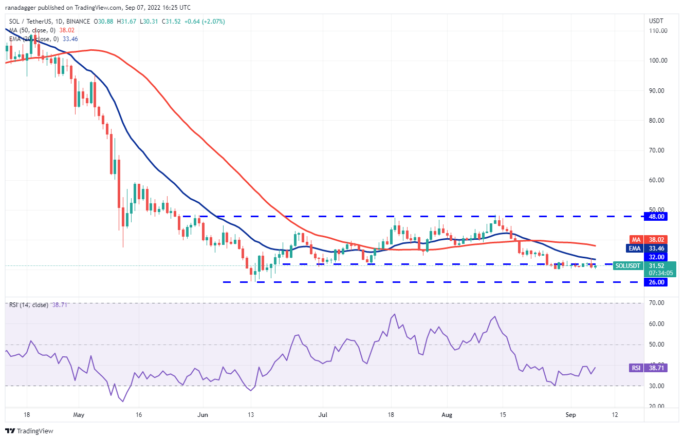 Solana (SOL) rallied to the 20-day EMA ($33) on Sept. 6 but the bulls could not overcome this barrier. This suggests that the sentiment remains negative and traders are selling on rallies.