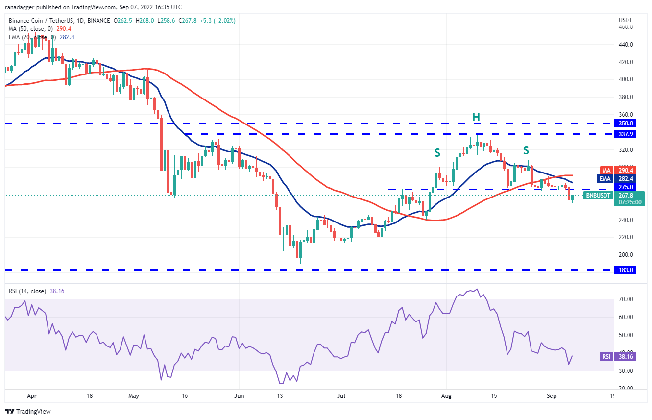 BNB turned down sharply from the 20-day EMA ($282) on Sept. 6 and broke below the critical support at $275. This completed a bearish H&S pattern.