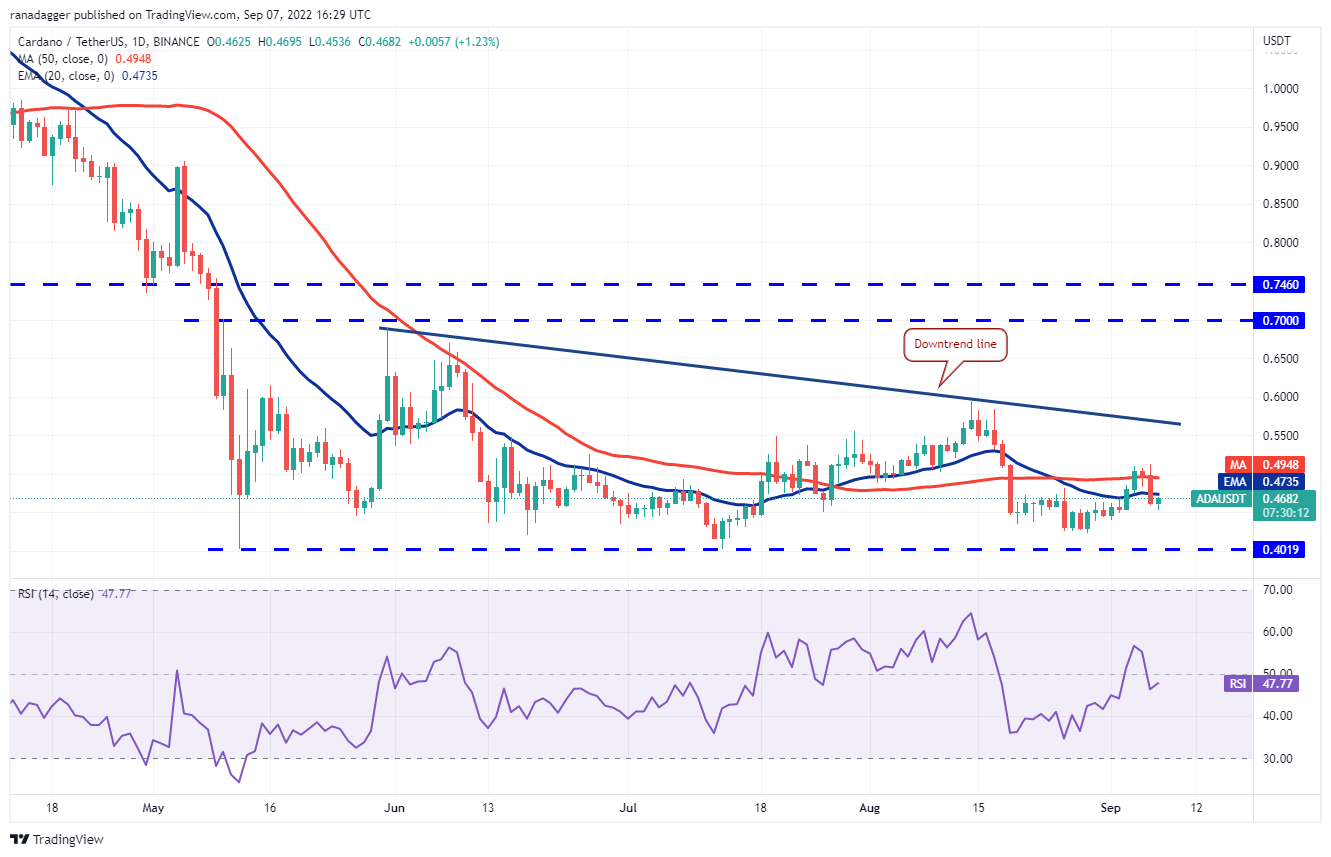 Cardano (ADA) closed above the 50-day simple moving average (SMA) (0.49) on Sept. 4 and the bulls defended the level on Sept. 5. Buyers tried to extend the relief rally on Sept. 6 but met with a wall of selling near $0.51.