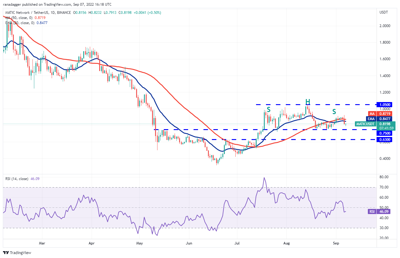 Buyers defended the 50-day SMA ($0.87) on Sept. 5 and attempted to extend the recovery on Sept. 6 but the bears had other plans. They sold aggressively at $0.92 and pulled Polygon (MATIC) back below the moving averages.