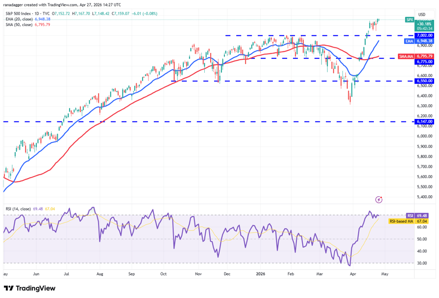 Sellers will have to swiftly yank the price back below the 20-day EMA to weaken the bullish momentum. If they manage to do that, the index may tumble to the 50-day simple moving average (6,795).