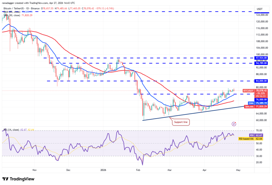 BTC has been sustaining above the breakout level of $76,000, indicating that the bulls are not hurrying to book profits.