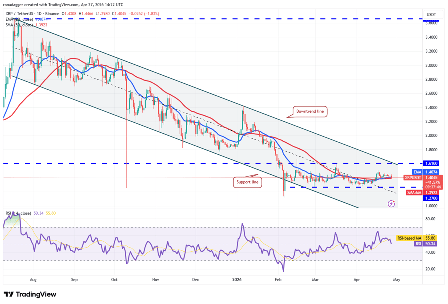 The 20-day EMA ($1.40) has started to turn up gradually, and the RSI is near the midpoint, indicating that the bulls have a slight edge. There is minor resistance at $1.51, but if it is crossed, the XRP/USDT pair may reach the downtrend line. A break and close above the downtrend line signals a potential trend change. The pair may then rally to $2.