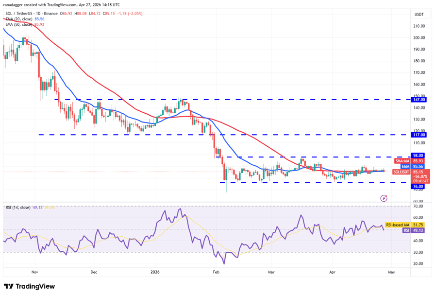 Solana (SOL) continues to trade near the moving averages, indicating a balance between supply and demand.