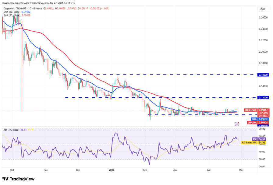 Dogecoin (DOGE) has been gradually moving higher but is expected to face selling in the $0.10 to $0.11 zone.