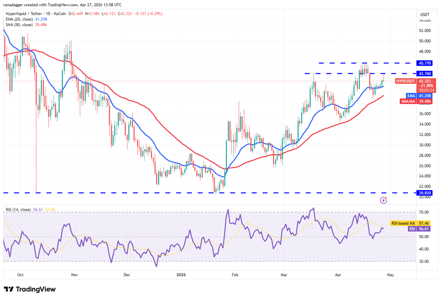 The uptrend is facing selling pressure in the $43.76 to $45.77 zone, as seen in the long wick on the candlestick. Sellers will attempt to sink the HYPE price below the 20-day EMA ($41.25), opening the door to a drop toward the 50-day SMA ($39.50).