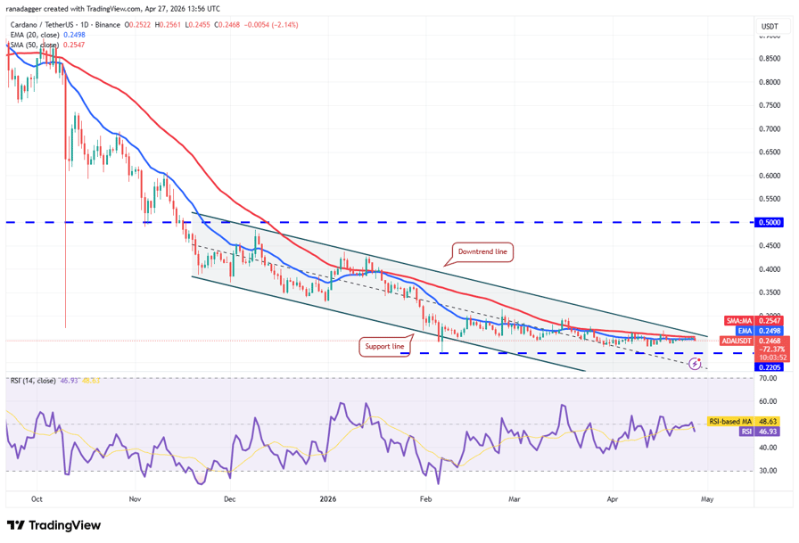 The downtrend line is the crucial resistance to watch out for as a close above it signals a potential short-term trend change. The ADA/USDT pair may surge to $0.32, then to $0.37.