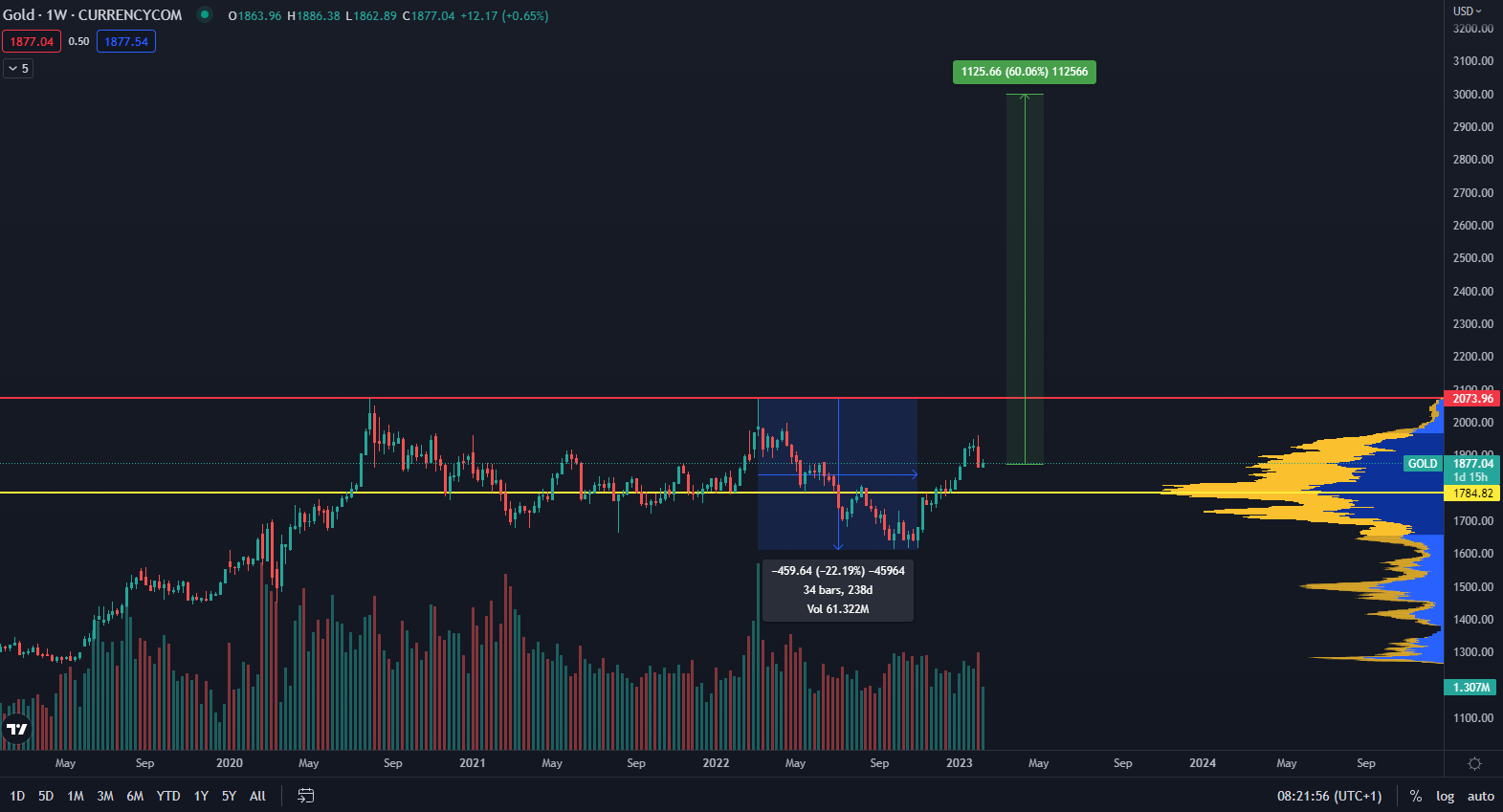 Zlato sa v čase písania článku obchoduje na hodnote 1 877 dolárov a má za sebou signifikantný rast. Napriek tomu vzostup zatiaľ nedokázal prekonať silu predošlej korekcie, ktorá znamenala znehodnotenie drahého kovu o 22 %. Ak sa viac zaujímate o aktuálnu analýzu ceny zlata, môžete si prečítať článok Čoskoro sa prepíše história: zlato smeruje na nové maximum.