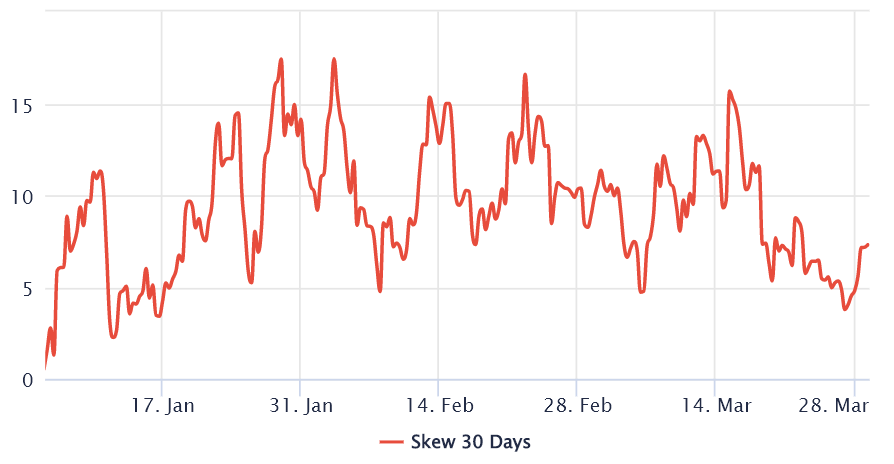 The skew indicator dropped below 10% on March 18, exiting the “fear” level as these options traders are no longer overcharging for downside protection. The current 7% level remains close to a bearish threshold.