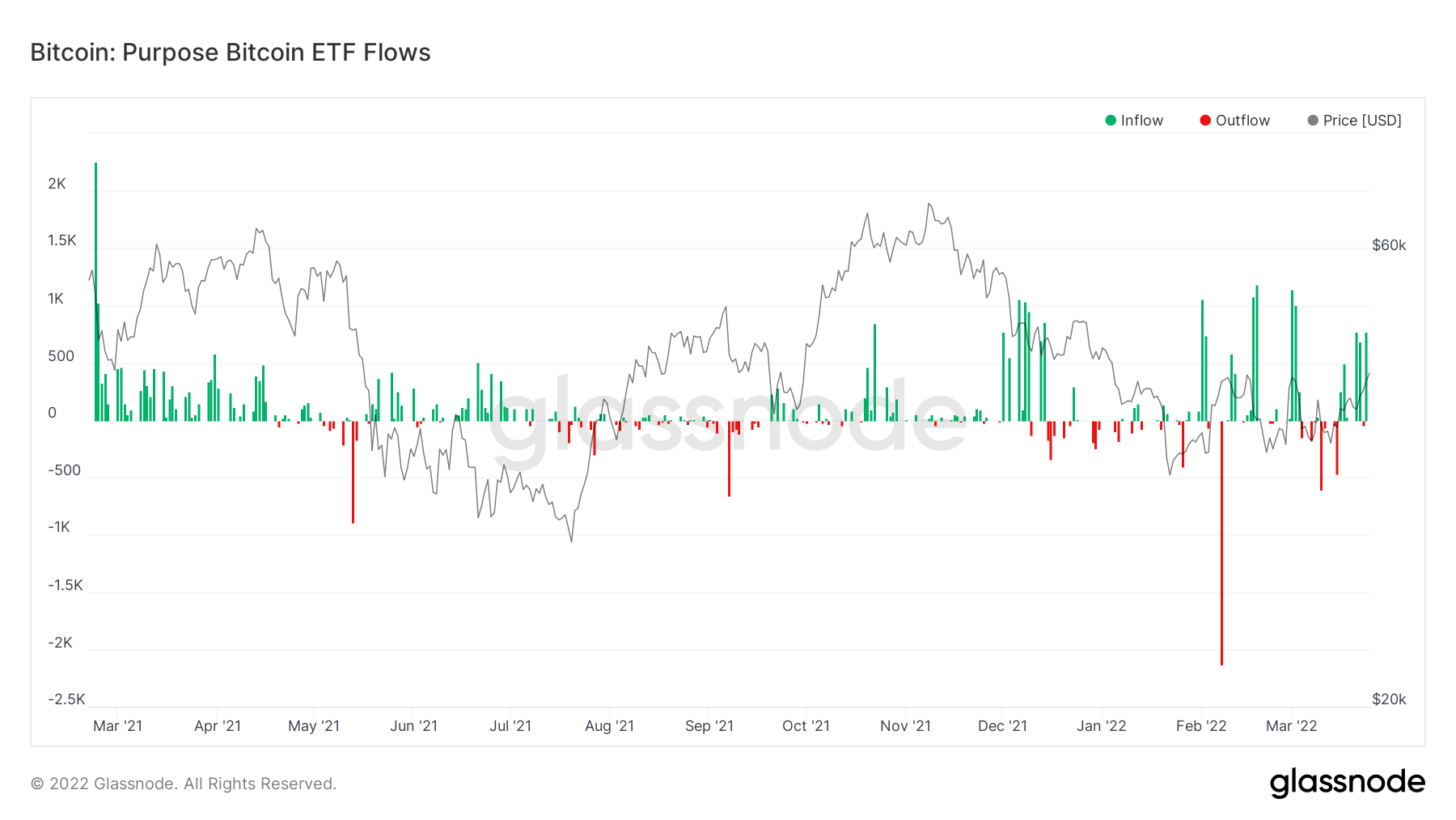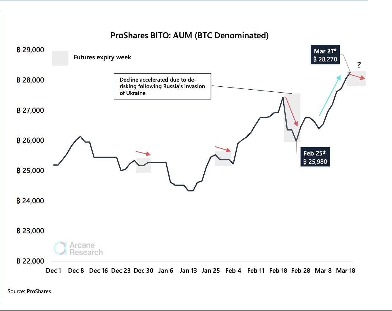 But on March 21 it also witnessed an inflow of 225 BTC to its coffers just as BITO rolled its 437 March contracts to April. That prompted Arcane to see a growing institutional demand for the fund. It wrote in its report: