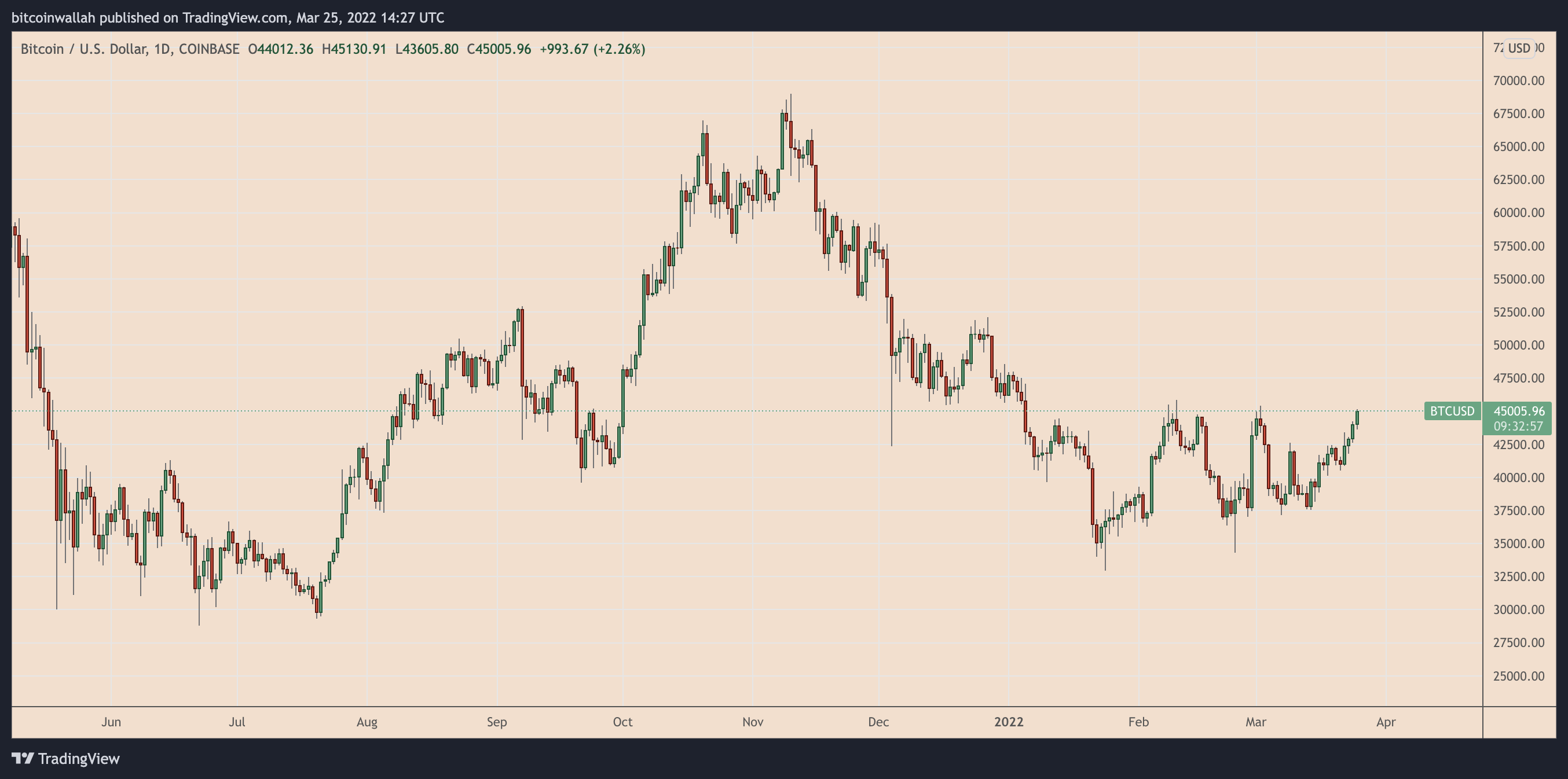 On Friday, Bitcoin climbed another 2.5% to over $45,000, its highest levels in over three weeks. Alexander Mamasidikov, co-founder of crypto wallet service MinePlex, noted that that BTC’s price could jump to $50,000 next.