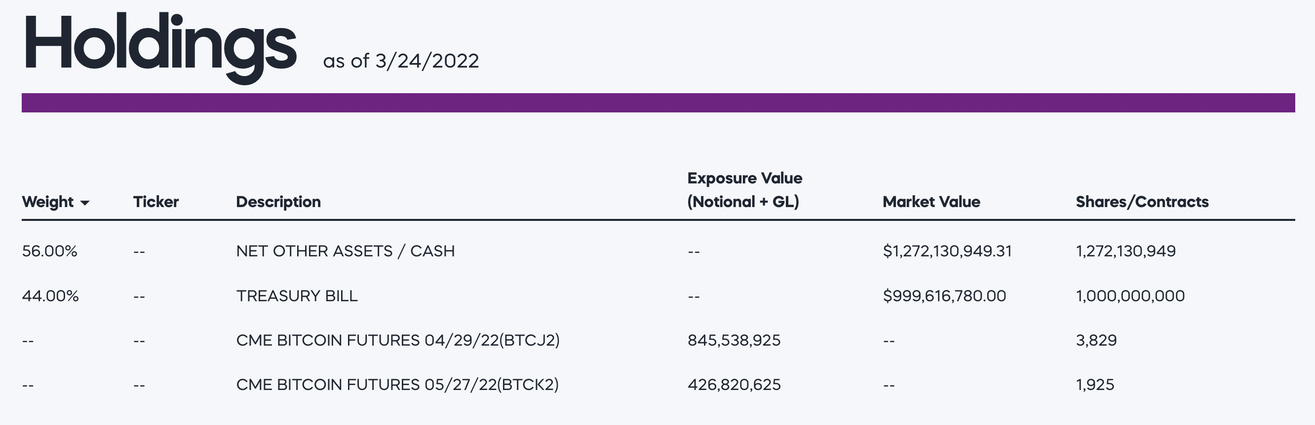 The fund, which uses futures contracts to gain exposure to Bitcoin’s price movements, had a record 28,450 BTC under its management — worth about $1.27 billion at today’s price — as of March 24, compared to nearly 26,000 BTC a month before, according to official data from ProShares.