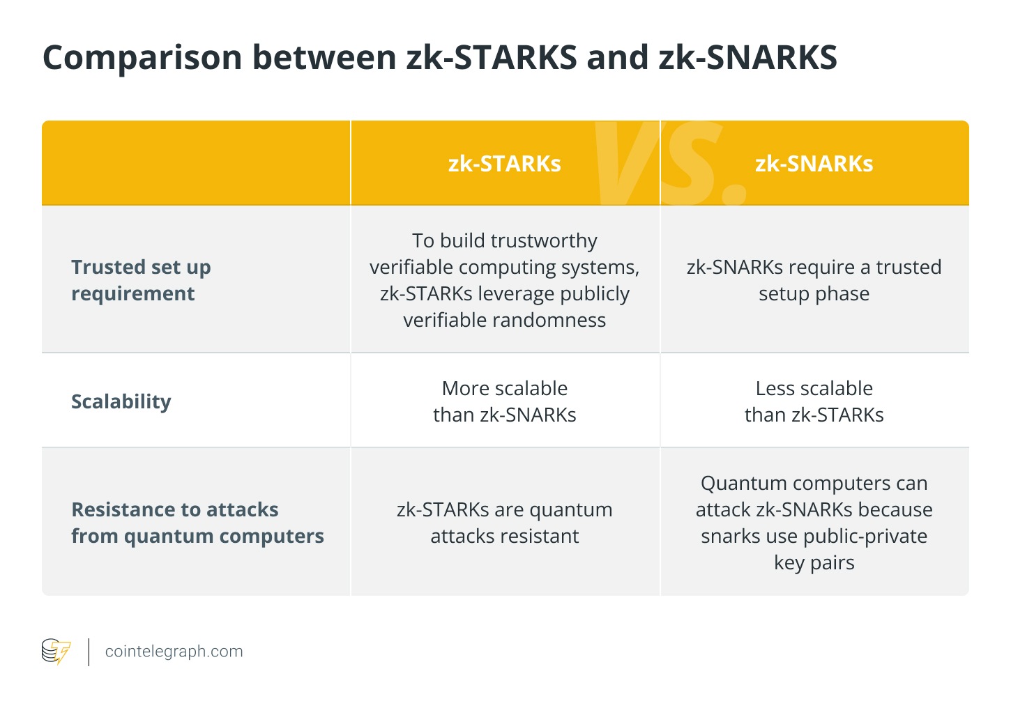 STARKs is a quantum-resistant system based on hash functions used by Ethereum, not elliptic curves utilized by Bitcoin. Importantly, STARKs systems are considered more advanced than their predecessors, zk-SNARKs, and can resist attacks from quantum computers.