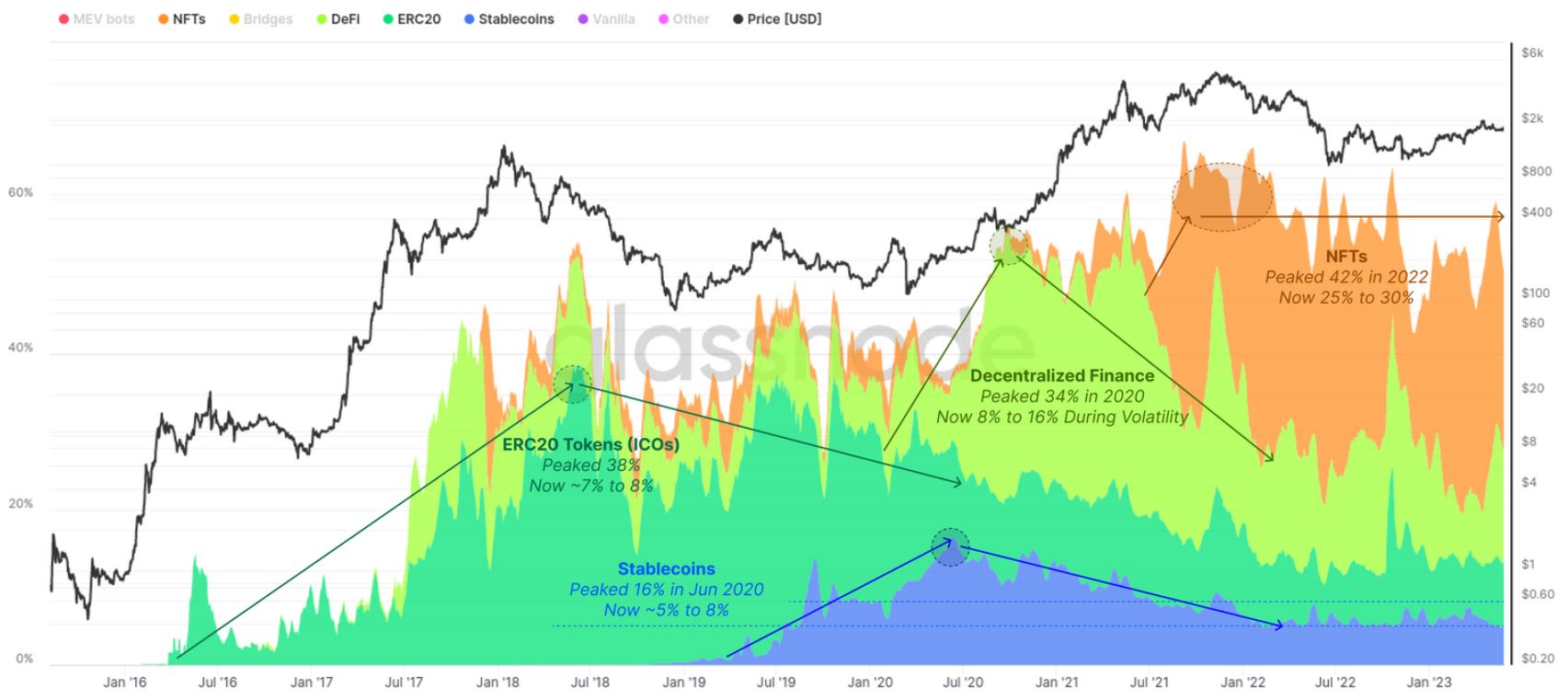 The percentage of gas consumed by DeFi protocols has dropped from 34% in 2020 to 8% to 16% presently, with NFTs commanding the maximum share of 25% to 30%, according to a recent report from Glassnode.