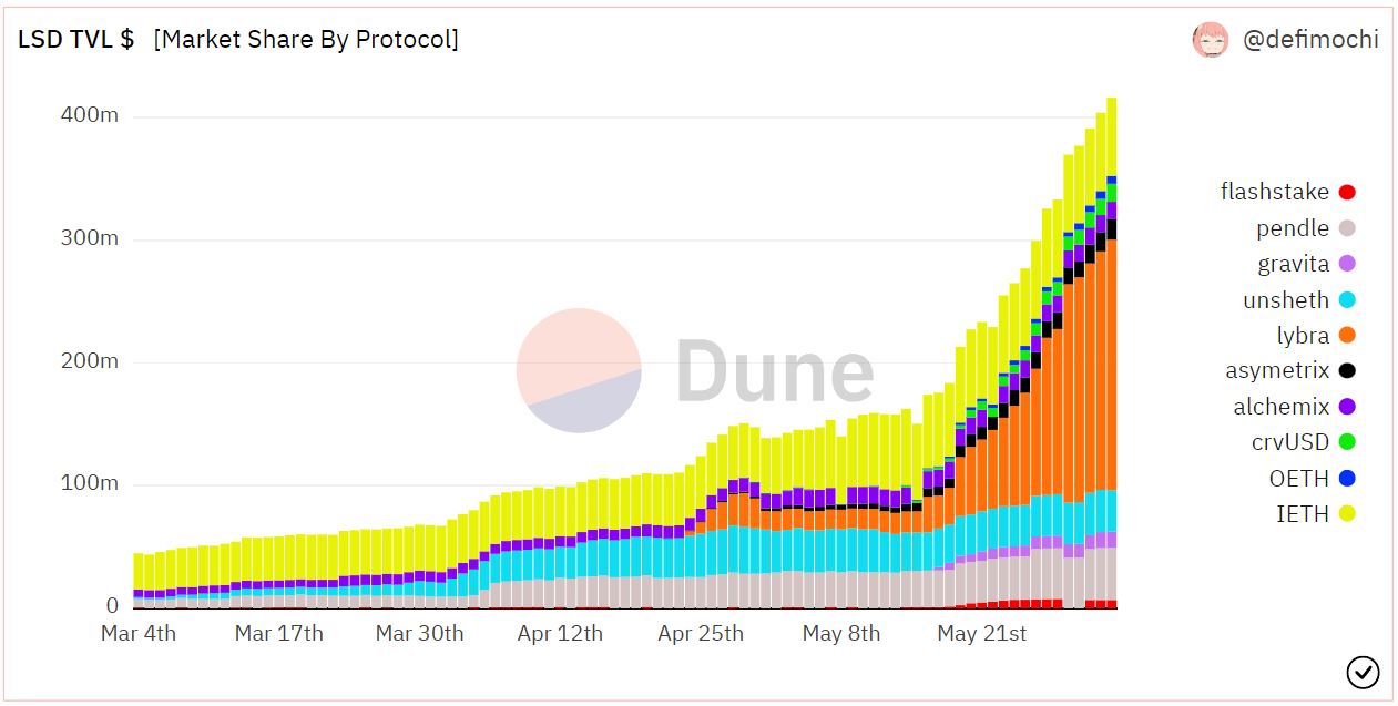 A Dune analytics dashboard by data analyst Defimochi shows the total value locked (TVL) in LSDfi protocols has touched $411 million, rising exponentially since mid-May. Some of the popular names in the sector are Pendle Finance, Lybra Finance, Curve Finance and Alchemix Protocol.