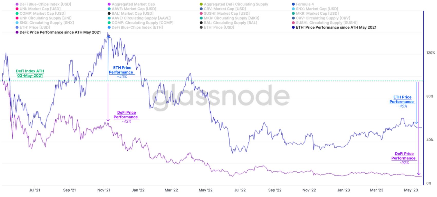 Glassnode’s supply-weighted price index for DeFi, priced in USD and ETH, recorded a 90% loss since early 2021.