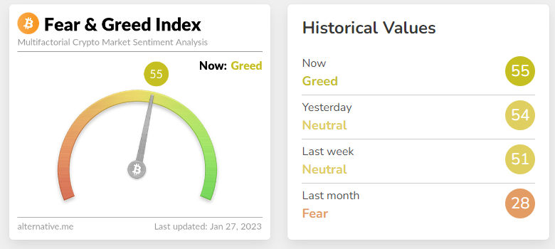 Už skôr sme vás informovali o tom, že až 97,5 % krátkodobých držiteľov dosahuje zisky a vždy v minulosti bola podobná situácia predzvesťou vytvorenia maxima. Prehnaný pozitivizmus signalizuje aj index strachu a chamtivosti, informuje Alternative. V čase písania článku index dosahuje chamtivosť na úrovni 55 bodov zo 100 a naposledy bola podobná úroveň zaznamenaná v marci 2022.
