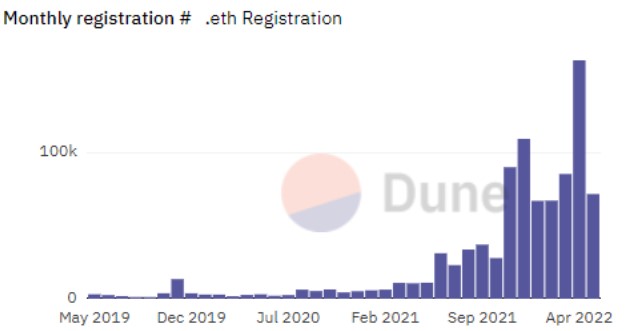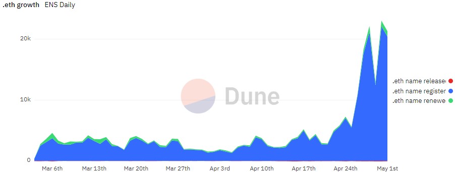 The sudden surge in registrations at the end of April capped off a record month for the project, which saw 162,978 new domain registrations, according to data from Dune Analytics.