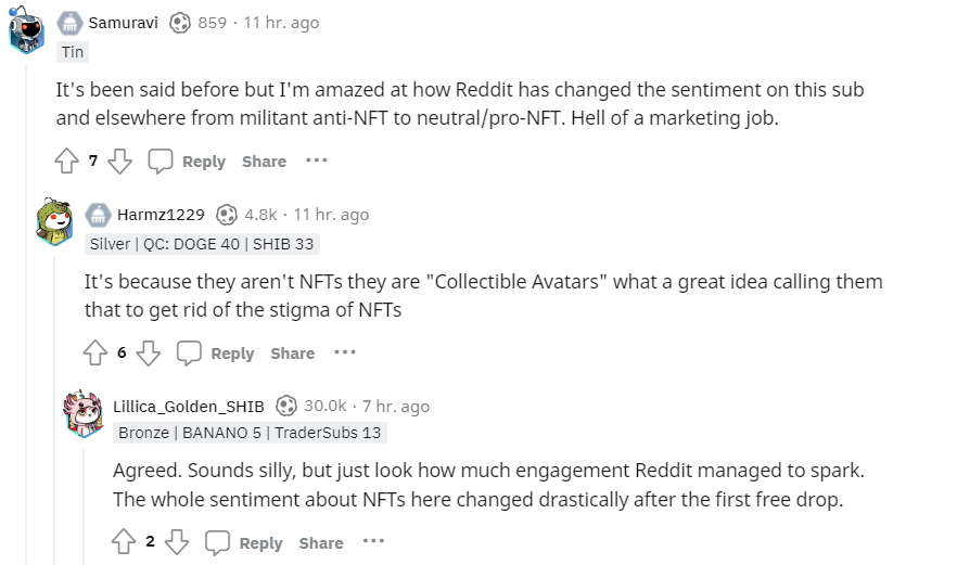 https://images.cointelegraph.com/images/840_aHR0cHM6Ly9zMy5jb2ludGVsZWdyYXBoLmNvbS91cGxvYWRzLzIwMjMtMDQvMzk2ZTdmM2UtNjk2NC00NWE2LThiZDktMTkxMTYzMWY0OTgxLkpQRw==.jpgCommunity members responded to the new development, with some praising Reddit’s marketing efforts and changing the anti-NFT narrative within the platform.