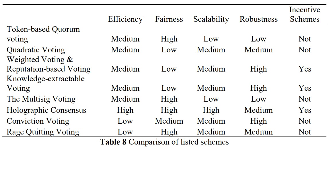 Each voting scheme was rated according to five vectors comprising efficiency (proposal selection and approval speed), fairness (with respect to voter equality), scalability (ability to adjust storage/computation/communications according to the number of voters), robustness (resilience against attacks and collusion), and incentive schemes (whether the design motivates voter behavior).