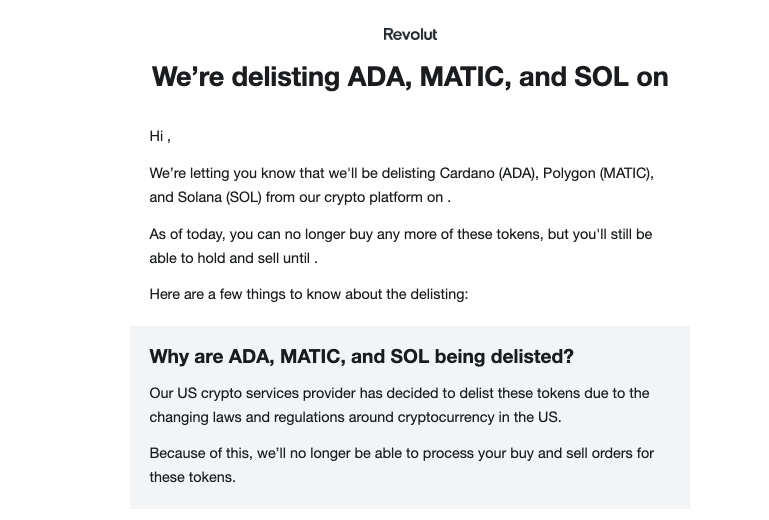 Revolut is not alone in delisting these particular three tokens. Companies like Robinhood, eToro and Bakkt all announced ADA, MATIC and SOL delistings over the past few weeks, immediately halting purchases.