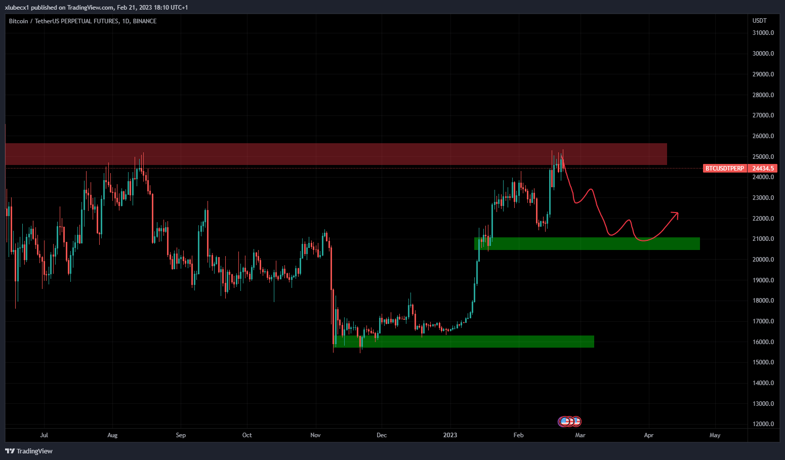 Bitcoinu sa celý tento mesiac nedarí preraziť rezistenciu, ktorá je tesne pod 25 000 dolármi. Je to signál k tomu, že na trhu nie je sila ďalej rásť. Viac ku scenáru, že bitcoin poklesne sa prikláňam aj preto, lebo už 3 mesiace nebol vo väčšej korekcii. Takáto situácie nastáva iba zriedka. Jednoducho, pre dlhodobý, zdravý cenový rast bude musieť prísť pohyb aj do protismeru.