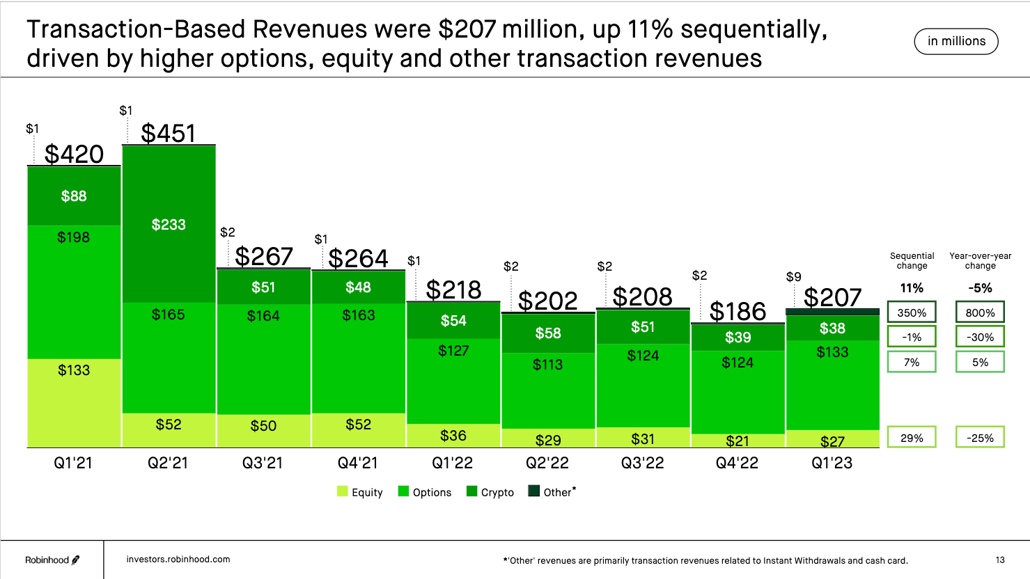At its peak in the second quarter of 2021, Robinhood boasted 21.3 million active users and more than $565 million in revenue. Things have soured for the brokerage firm of late, with Robinhood’s Q1 2023 results showing a 44% decline in monthly active users and a 30% year-over-year decline in revenue.