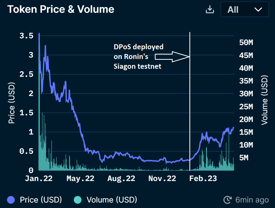 The Ronin team deployed the DPoS consensus mechanism on the network’s testnet on January 5, grabbing the market’s attention which was evident in its price rise. RON token also benefited from its listing on the MEXC exchange on February 7.