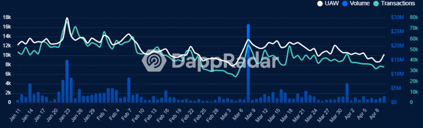 The Axie Network also witnessed an uptick in usage in January after the launch of land gameplay and new earnings mechanics for players, according to DappRadar. However, the trading volumes have dipped slightly after the land gameplay hype subsided in February.