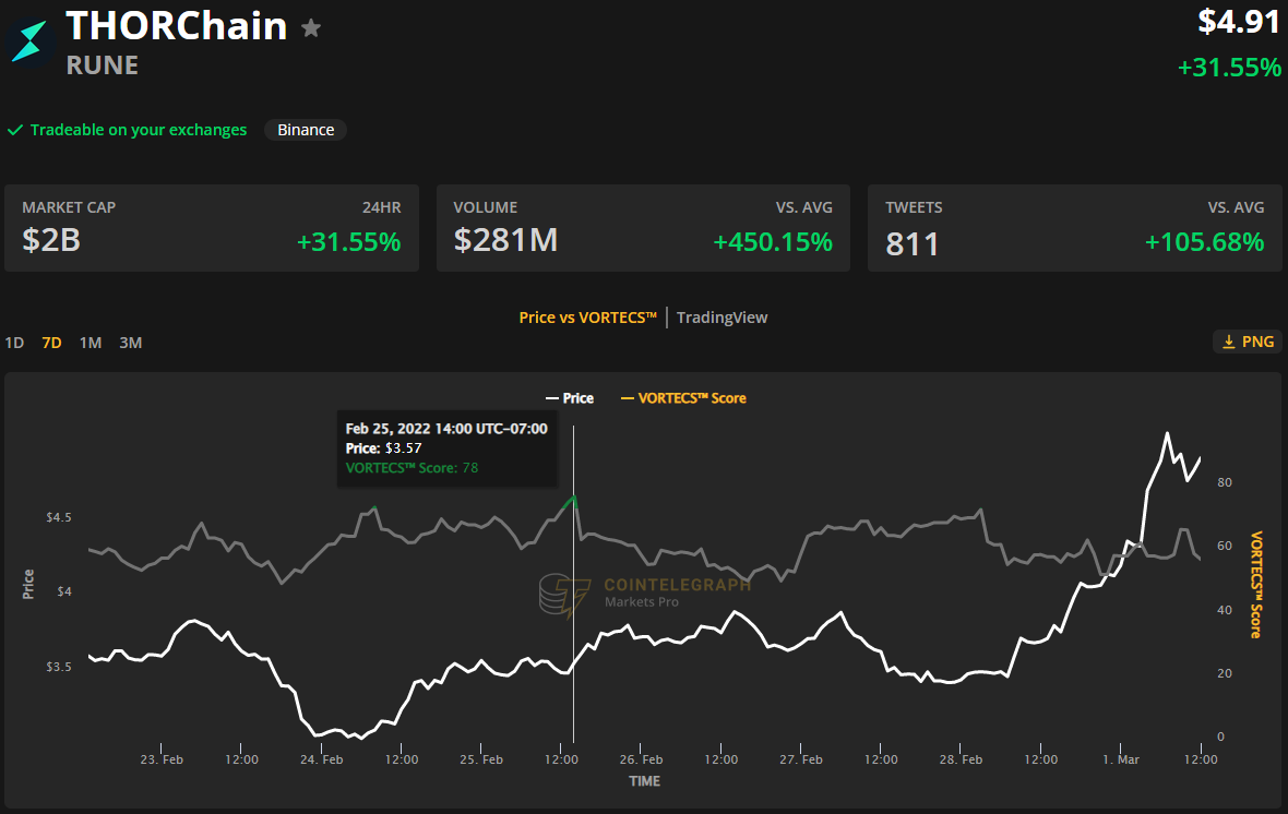 Data from Cointelegraph Markets Pro and TradingView shows that after hitting a low of $3.00 on Feb. 24, the price of RUNE has rallied 74.2% to a daily high at $5.23 on March 1 amid a 388% surge in its 24-hour trading volume.