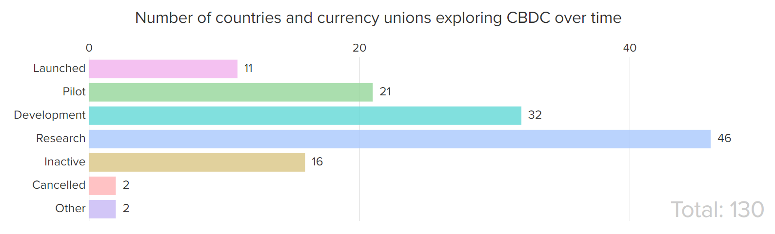Digitálnu menu centrálnych bánk (CBDC) sa snaží do bežného života občanov zaviesť už mnoho krajín. Štatistiky Atlanticcouncil ukazujú, že v súčasnosti skúma zavádzanie digitálnej meny centrálnej banky až 130 krajín.
